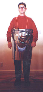 Can: Metal garbage can, bottom cut out, spout made from flashing. Bungee cords bruised my shoulders, and the flashing was a bit sharp & dangerous. |