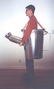 Can: Metal garbage can, bottom cut out, spout made from flashing. Bungee cords bruised my shoulders, and the flashing was a bit sharp & dangerous. |