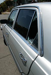 The 1976 Mercedes Benz, parked on the street in front of hardtuned.com headquarters was the target of stereo thieves Monday night or early Tuesday morning 6/25.