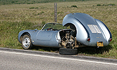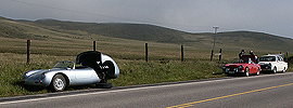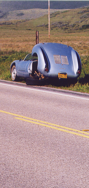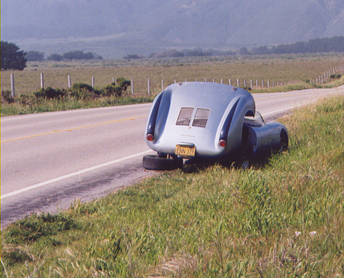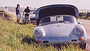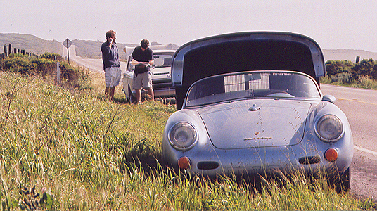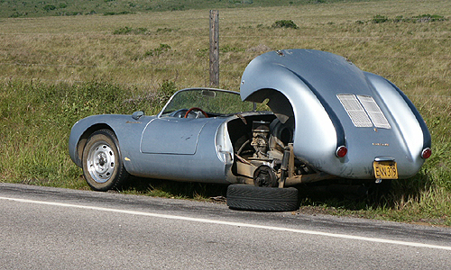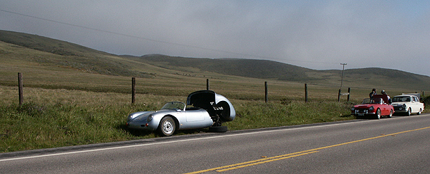 Geb Masterson's 550 cleaned the splines right off of the left rear drum on Highway One. Unfortunately this was the end of Masterson's Iron Bottom. Just before the incident while gassing-up in Cambria Geb met a Porsche fanatic that happened to own the local motel. A quick call to him while watching the cows and waiting for a tow yielded the contact information for a local VW/Porsche mechanic, and a discount room. The motel owner rolled out in his new 911 to pick him up. The 550 was fixed by 3:30 the next day, and headed back home under its own power.