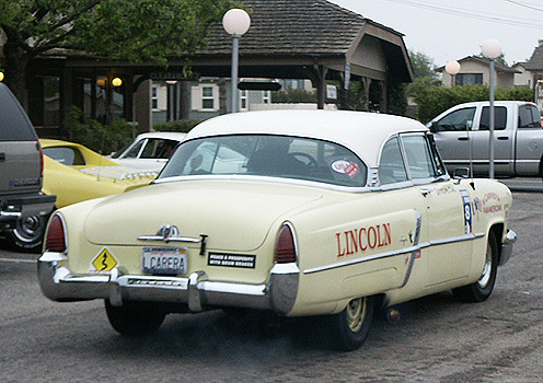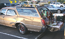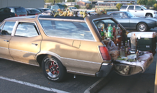 The star of all of the parking lots was the Abernathy's Vista Cruiser "Bar Car" Wagon. In the photo above right, the yellow arrows are pointing to the two CHP cruisers parked 30 yards from the rolling open container.