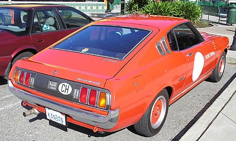 Enjoying the piped in Muzak© while securing coffee inside the outlet mall in Gilroy, CA. Martin Swig's 1975 Toyota Celica Liftback from Switzerland looks rather conspicuous among rabid shoppers and their Saturns and SUVs.