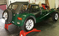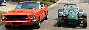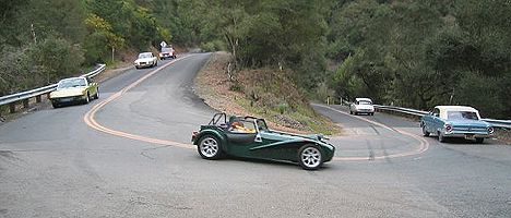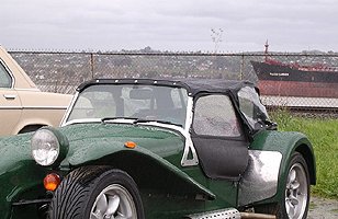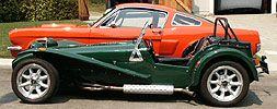 '89 Caterham Seven : 1700cc BDR Cosworth, De Dion rear end, 15" Panasports with Yokohamas and 13" Revolutions. Full Weather Gear, and creature comforts like heater, sidecurtains. FAST. Suprisingly comfortable for long drives - but if you are doing 6 or more hours on the freeway, bring some earplugs.