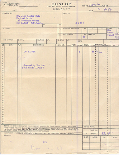 The invoice below is dated January 3rd 1959. Dunlop received their deposit on November 5th of 1958. The total cost to Vander Male was $82.50