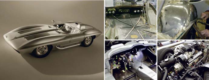 The physical restoration started in August of 2004 and ran through February. A team of 15 people, with about five key players including Jacobson, performed the work. All were members of the UAW, and the labor was performed off the clock. Some would stay late or work on the Sting Ray while other Design jobs were setting up or drying. Virtually all of the work was done in-house, with the exception of the master-cylinder rebuild and the bending of new stainless-steel sidepipes.