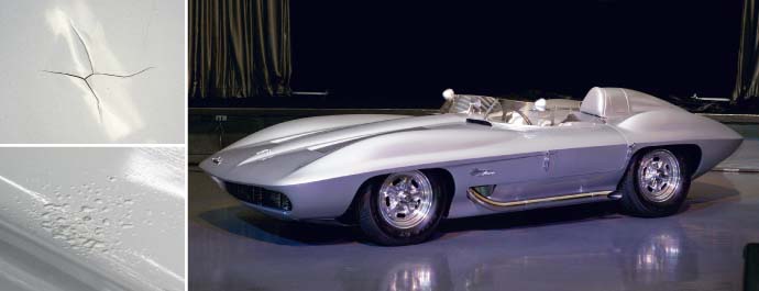 Despite Jacobson's care, time eventually took its toll on the former racecar, especially its extra-thin glass bodywork. The rear deck was most affected, where the car had been pushed into countless auto-show venues against the force of its locked rear axle. As the resin slowly deformed and deteriorated the deck stretched, cracked, and became wavy. Underneath the skin, all of the rubber parts started to rot out as well.