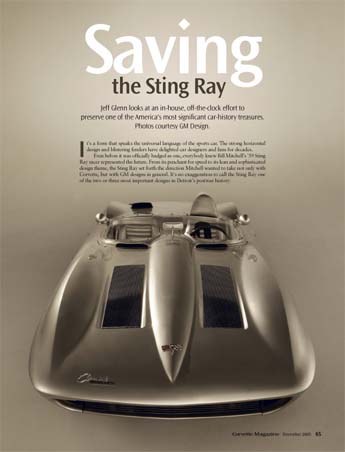 . . .Saving the Sting RayJeff Glenn looks at an in-house, off-the-clock effort to preserve one of the America's most significant car-history treasures. Photos courtesy GM Design. It's a form that speaks the universal language of the sports car. The strong horizontal design and blistering fenders have delighted car designers and fans for decades. Even before it was officially badged as one, everybody knew Bill Mitchell's '59 Sting Ray racer represented the future. From its penchant for speed to its lean and sophisticated design theme, the Sting Ray set forth the direction Mitchell wanted to take not only with Corvette, but with GM designs in general. It's no exaggeration to call the Sting Ray one of the two or three most important designs in Detroit's postwar history. |
